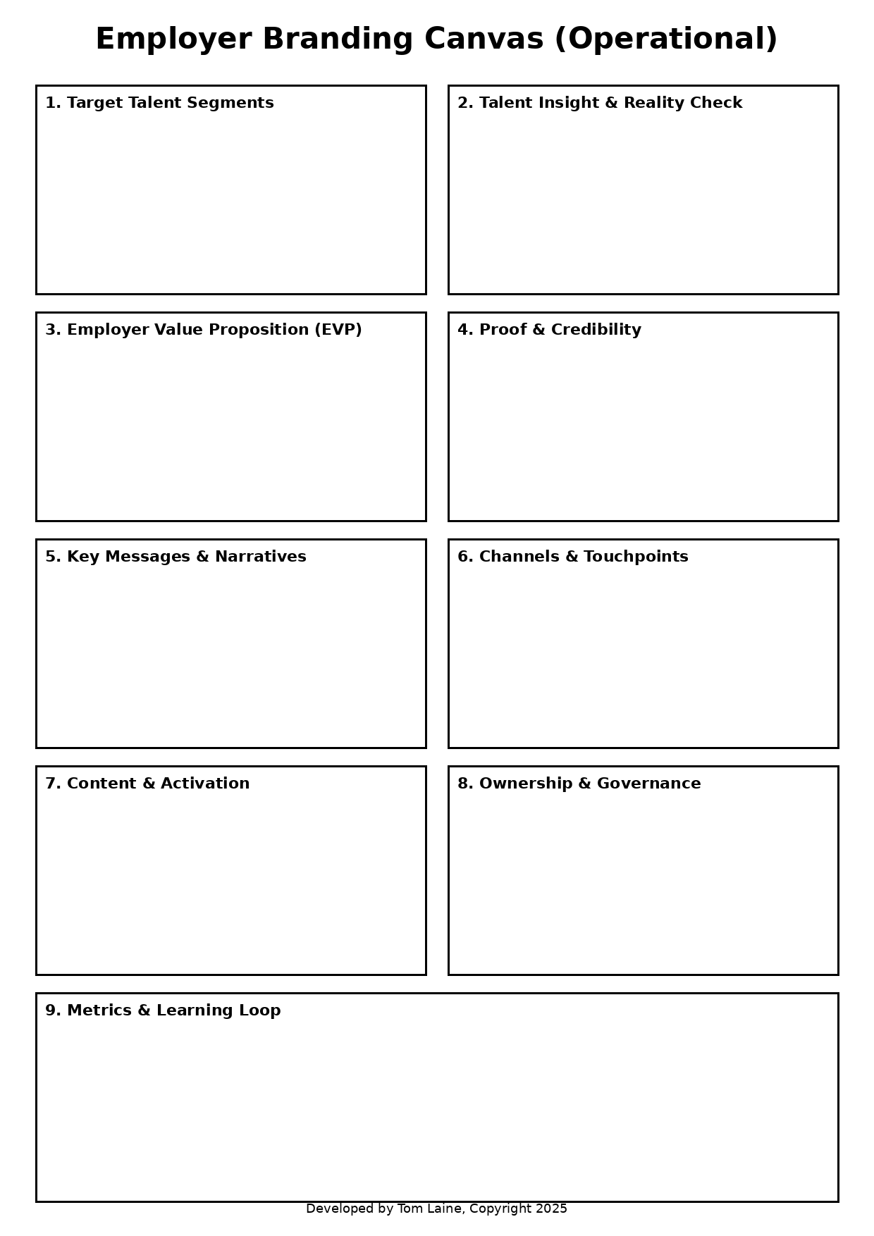 The Operational Employer Branding Canvas is a structured planning and execution tool created by Tom Laine that converts employer brand strategy into prioritised operational initiatives.
